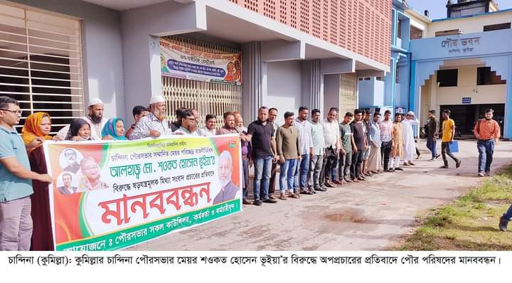কুমিল্লার চান্দিনা পৌরসভার মেয়র মো. শওকত হোসেন ভ‚ইয়া’র বিরুদ্ধে সামাজিক যোগাযোগ মাধ্যম ফেইসবুক ও বিভিন্ন পত্রিকায় অপপ্রচারের প্রতিবাদে মানববন্ধন করে পৌর পরিষদ।