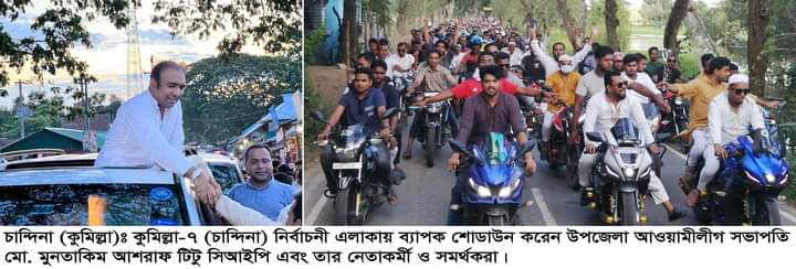 দ্বাদশ জাতীয় সংসদ নির্বাচন সামনে রেখে কুমিল্লা-৭ (চান্দিনা) নির্বাচনী এলাকায় ব্যাপক শোডাউন করেন উপজেলা আওয়ামীলীগ সভাপতি মো. মুনতাকিম আশরাফ টিটু সিআইপি এবং তার নেতাকর্মী ও সমর্থকরা। মুনতাকিম আশরাফ কুমিল্লা উত্তর জেলা আওয়ামীলীগের সাবেক যুগ্ম-সাধারণ সম্পদক এবং ব্যবসায়ীদের শীর্ষ সংগঠন এফবিসিসিআই এর বর্তমান পরিচালক ও সাবেক সিনিয়র সহ-সভাপতি।